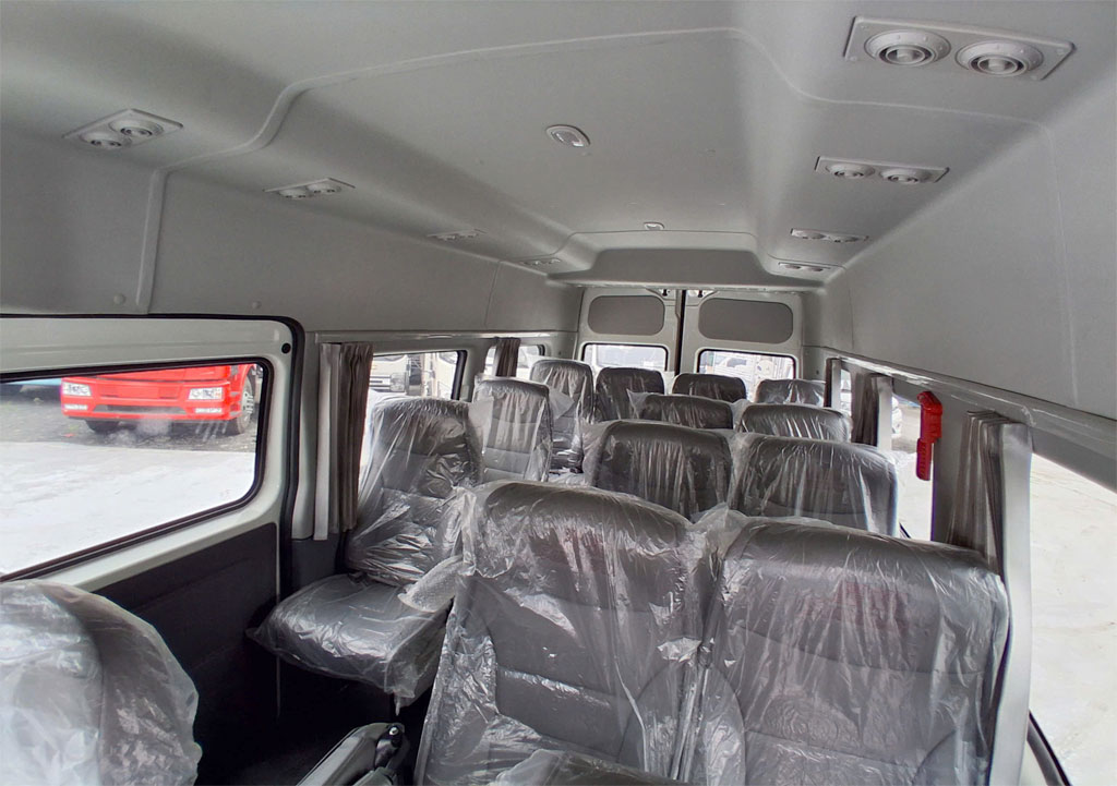 JAC Sunray có kích thước khoang hành khách rộng, cao thoáng khí, lắp đặt 12 ghế nệm cố định, bọc da simili, 01 ghế gấp, sàn di chuyển qua lại dễ dàng, vách bọc nỉ và cách âm cách nhiệt hiệu quả, ttrần có 8 cửa gió máy lạnh khe gió có gạt tùy chỉnh